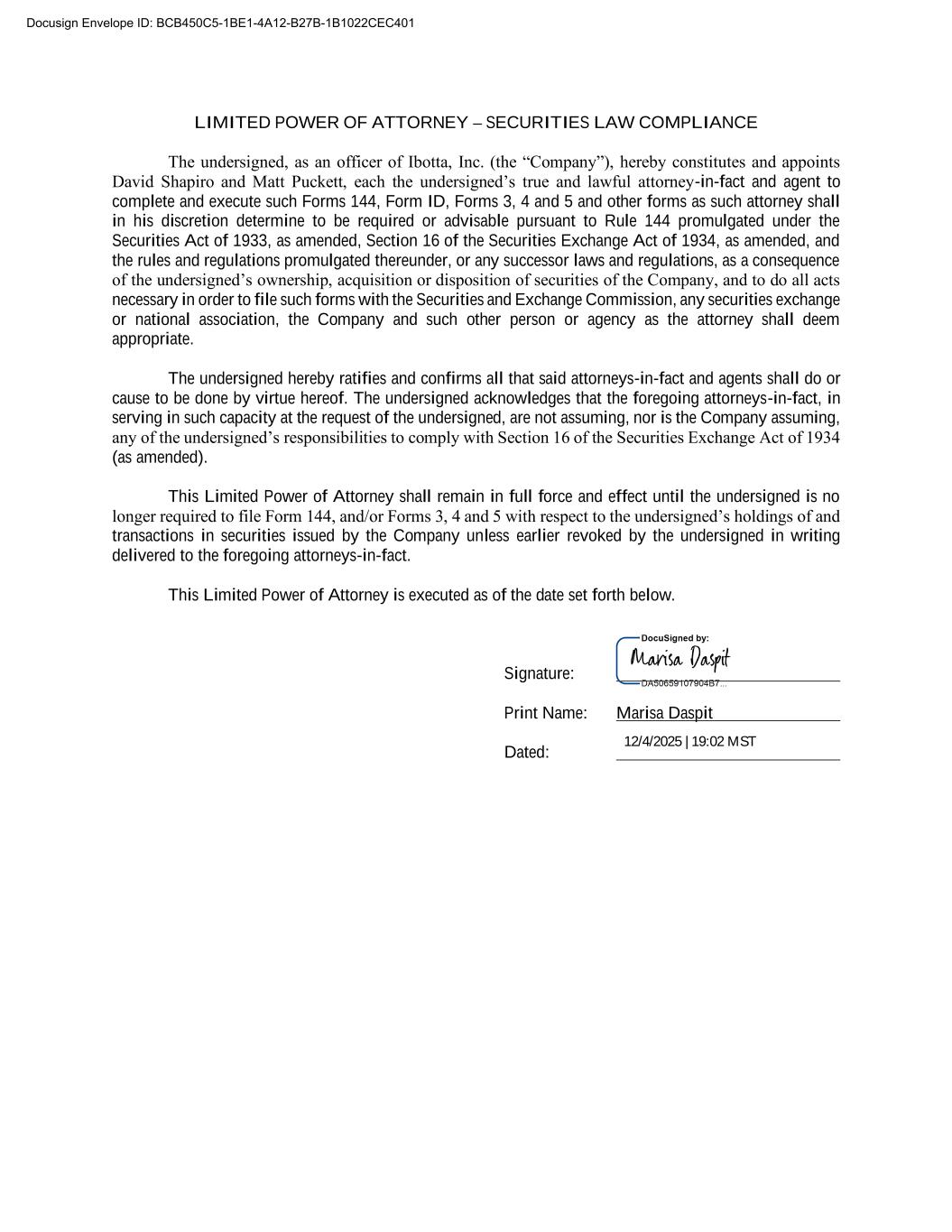 LIMITED POWER OF ATTORNEY – SECURITIES LAW COMPLIANCE The undersigned, as an officer of Ibotta, Inc. (the “Company”), hereby constitutes and appoints David Shapiro and Matt Puckett, each the undersigned’s true and lawful attorney-in-fact and agent to complete and execute such Forms 144, Form ID, Forms 3, 4 and 5 and other forms as such attorney shall in his discretion determine to be required or advisable pursuant to Rule 144 promulgated under the Securities Act of 1933, as amended, Section 16 of the Securities Exchange Act of 1934, as amended, and the rules and regulations promulgated thereunder, or any successor laws and regulations, as a consequence of the undersigned’s ownership, acquisition or disposition of securities of the Company, and to do all acts necessary in order to file such forms with the Securities and Exchange Commission, any securities exchange or national association, the Company and such other person or agency as the attorney shall deem appropriate. The undersigned hereby ratifies and confirms all that said attorneys-in-fact and agents shall do or cause to be done by virtue hereof. The undersigned acknowledges that the foregoing attorneys-in-fact, in serving in such capacity at the request of the undersigned, are not assuming, nor is the Company assuming, any of the undersigned’s responsibilities to comply with Section 16 of the Securities Exchange Act of 1934 (as amended). This Limited Power of Attorney shall remain in full force and effect until the undersigned is no longer required to file Form 144, and/or Forms 3, 4 and 5 with respect to the undersigned’s holdings of and transactions in securities issued by the Company unless earlier revoked by the undersigned in writing delivered to the foregoing attorneys-in-fact. This Limited Power of Attorney is executed as of the date set forth below. Signature: Print Name: Marisa Daspit Dated: Docusign Envelope ID: BCB450C5-1BE1-4A12-B27B-1B1022CEC401 12/4/2025 | 19:02 MST