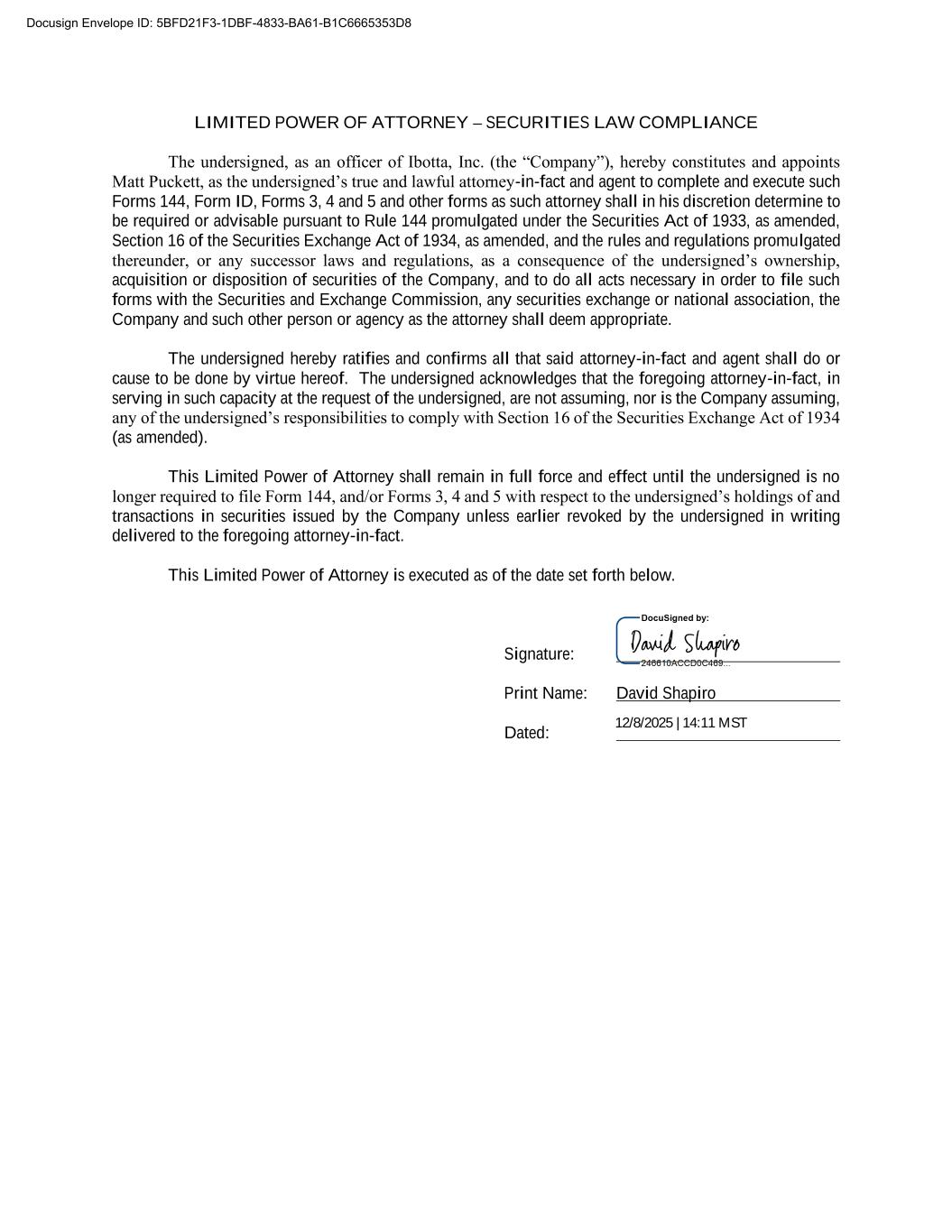 LIMITED POWER OF ATTORNEY – SECURITIES LAW COMPLIANCE The undersigned, as an officer of Ibotta, Inc. (the “Company”), hereby constitutes and appoints Matt Puckett, as the undersigned’s true and lawful attorney-in-fact and agent to complete and execute such Forms 144, Form ID, Forms 3, 4 and 5 and other forms as such attorney shall in his discretion determine to be required or advisable pursuant to Rule 144 promulgated under the Securities Act of 1933, as amended, Section 16 of the Securities Exchange Act of 1934, as amended, and the rules and regulations promulgated thereunder, or any successor laws and regulations, as a consequence of the undersigned’s ownership, acquisition or disposition of securities of the Company, and to do all acts necessary in order to file such forms with the Securities and Exchange Commission, any securities exchange or national association, the Company and such other person or agency as the attorney shall deem appropriate. The undersigned hereby ratifies and confirms all that said attorney-in-fact and agent shall do or cause to be done by virtue hereof. The undersigned acknowledges that the foregoing attorney-in-fact, in serving in such capacity at the request of the undersigned, are not assuming, nor is the Company assuming, any of the undersigned’s responsibilities to comply with Section 16 of the Securities Exchange Act of 1934 (as amended). This Limited Power of Attorney shall remain in full force and effect until the undersigned is no longer required to file Form 144, and/or Forms 3, 4 and 5 with respect to the undersigned’s holdings of and transactions in securities issued by the Company unless earlier revoked by the undersigned in writing delivered to the foregoing attorney-in-fact. This Limited Power of Attorney is executed as of the date set forth below. Signature: Print Name: David Shapiro Dated: Docusign Envelope ID: 5BFD21F3-1DBF-4833-BA61-B1C6665353D8 12/8/2025 | 14:11 MST