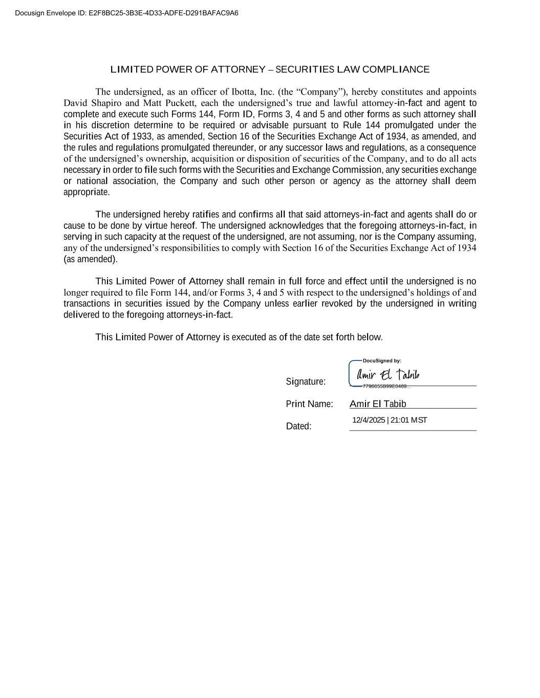 LIMITED POWER OF ATTORNEY – SECURITIES LAW COMPLIANCE The undersigned, as an officer of Ibotta, Inc. (the “Company”), hereby constitutes and appoints David Shapiro and Matt Puckett, each the undersigned’s true and lawful attorney-in-fact and agent to complete and execute such Forms 144, Form ID, Forms 3, 4 and 5 and other forms as such attorney shall in his discretion determine to be required or advisable pursuant to Rule 144 promulgated under the Securities Act of 1933, as amended, Section 16 of the Securities Exchange Act of 1934, as amended, and the rules and regulations promulgated thereunder, or any successor laws and regulations, as a consequence of the undersigned’s ownership, acquisition or disposition of securities of the Company, and to do all acts necessary in order to file such forms with the Securities and Exchange Commission, any securities exchange or national association, the Company and such other person or agency as the attorney shall deem appropriate. The undersigned hereby ratifies and confirms all that said attorneys-in-fact and agents shall do or cause to be done by virtue hereof. The undersigned acknowledges that the foregoing attorneys-in-fact, in serving in such capacity at the request of the undersigned, are not assuming, nor is the Company assuming, any of the undersigned’s responsibilities to comply with Section 16 of the Securities Exchange Act of 1934 (as amended). This Limited Power of Attorney shall remain in full force and effect until the undersigned is no longer required to file Form 144, and/or Forms 3, 4 and 5 with respect to the undersigned’s holdings of and transactions in securities issued by the Company unless earlier revoked by the undersigned in writing delivered to the foregoing attorneys-in-fact. This Limited Power of Attorney is executed as of the date set forth below. Signature: Print Name: Amir El Tabib Dated: Docusign Envelope ID: E2F8BC25-3B3E-4D33-ADFE-D291BAFAC9A6 12/4/2025 | 21:01 MST