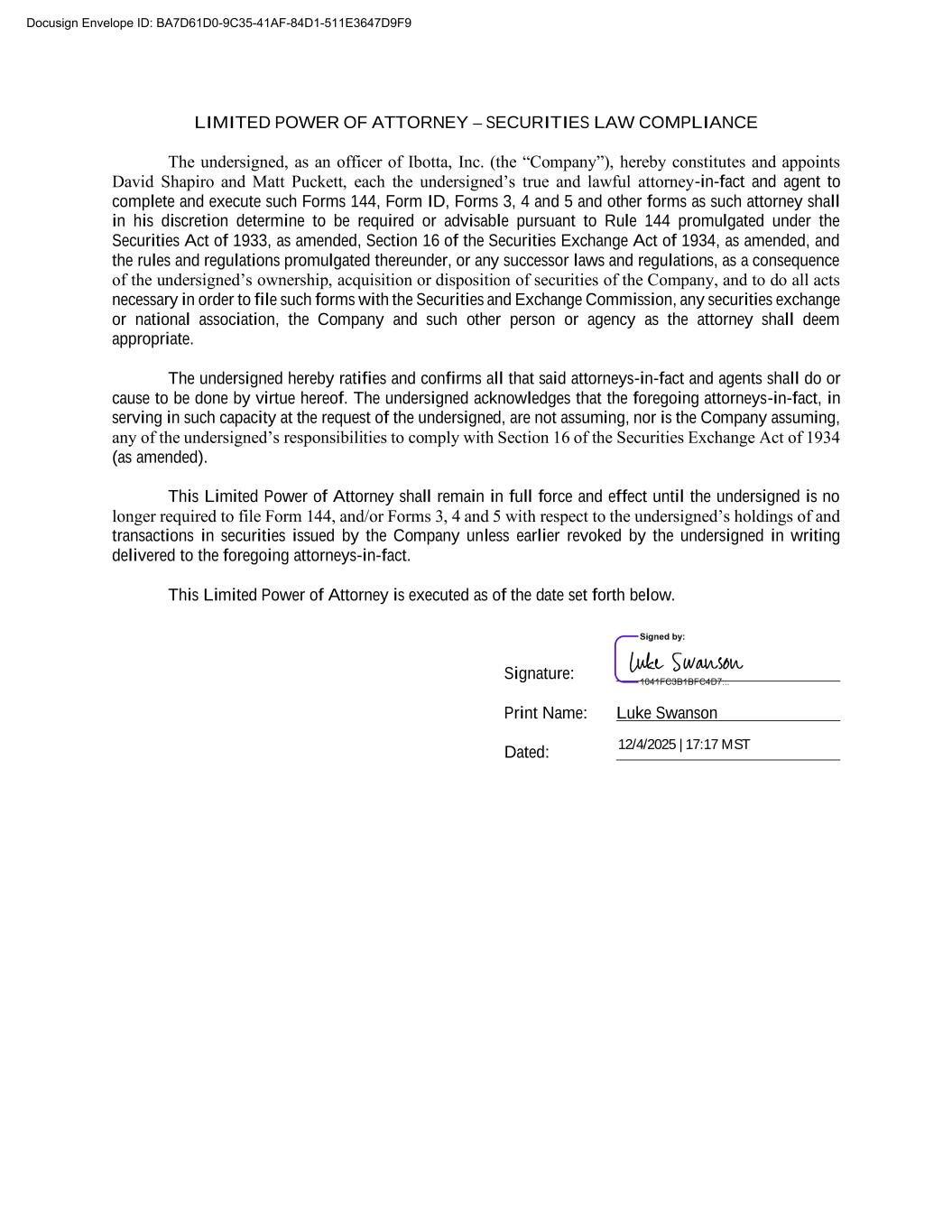 LIMITED POWER OF ATTORNEY – SECURITIES LAW COMPLIANCE The undersigned, as an officer of Ibotta, Inc. (the “Company”), hereby constitutes and appoints David Shapiro and Matt Puckett, each the undersigned’s true and lawful attorney-in-fact and agent to complete and execute such Forms 144, Form ID, Forms 3, 4 and 5 and other forms as such attorney shall in his discretion determine to be required or advisable pursuant to Rule 144 promulgated under the Securities Act of 1933, as amended, Section 16 of the Securities Exchange Act of 1934, as amended, and the rules and regulations promulgated thereunder, or any successor laws and regulations, as a consequence of the undersigned’s ownership, acquisition or disposition of securities of the Company, and to do all acts necessary in order to file such forms with the Securities and Exchange Commission, any securities exchange or national association, the Company and such other person or agency as the attorney shall deem appropriate. The undersigned hereby ratifies and confirms all that said attorneys-in-fact and agents shall do or cause to be done by virtue hereof. The undersigned acknowledges that the foregoing attorneys-in-fact, in serving in such capacity at the request of the undersigned, are not assuming, nor is the Company assuming, any of the undersigned’s responsibilities to comply with Section 16 of the Securities Exchange Act of 1934 (as amended). This Limited Power of Attorney shall remain in full force and effect until the undersigned is no longer required to file Form 144, and/or Forms 3, 4 and 5 with respect to the undersigned’s holdings of and transactions in securities issued by the Company unless earlier revoked by the undersigned in writing delivered to the foregoing attorneys-in-fact. This Limited Power of Attorney is executed as of the date set forth below. Signature: Print Name: Luke Swanson Dated: Docusign Envelope ID: BA7D61D0-9C35-41AF-84D1-511E3647D9F9 12/4/2025 | 17:17 MST
